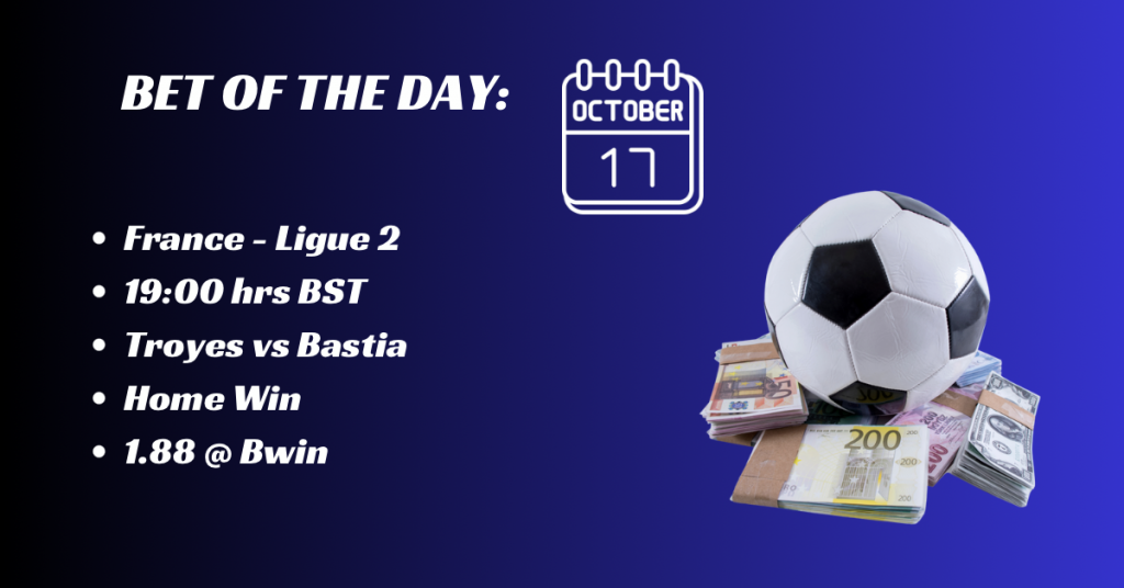 After nine rounds Troyes lead Ligue 2. Tonight they play hosts to bottom club Bastia. Troyes have won all five home games this season, whereas Bastia have not won any of their away games, losing three and drawing two. Troyes have won this fixture both times over the last two seasons by 2 – 0 each time.
